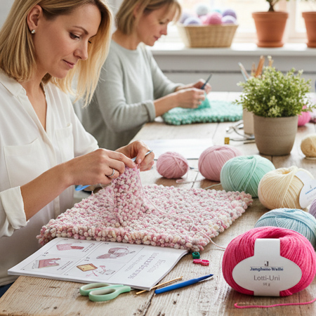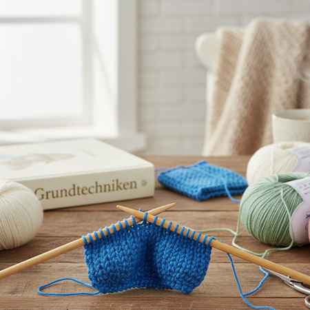 Die Basics des Strickens sind Maschen anschlagen, die zwei Grundmaschen rechte Maschen und linke Maschen sowie das Maschen abketten. Muster wie Glatt rechts entstehen durch den Wechsel dieser Grundmaschen.