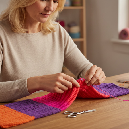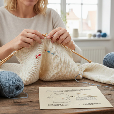 Das Verlängern von Strickteilen setzt natürlich voraus, dass noch ein Rest desselben Garns vorhanden ist oder Sie verwenden ein Garn ähnlicher Qualität mit denselben Pflegeeigenschaften. Sie können auch in einer Kontrastfarbe Musterstreifen einfügen.