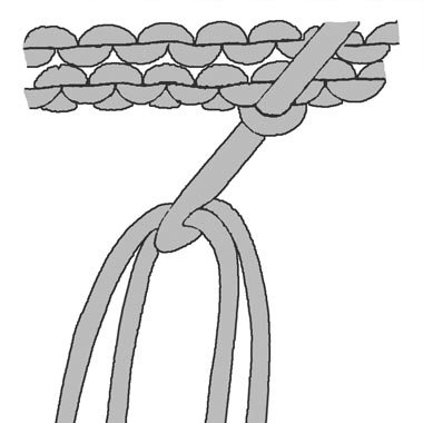 Für jede Franse nimmt man die gewünschte Anzahl dieser Fäden, sticht mit einer Häkelnadel von der linken Seite in den Rand des Strick- bzw. Häkelteils, fasst die Fransenfäden genau in der Mitte und zieht sie zu einer Schlaufe durch