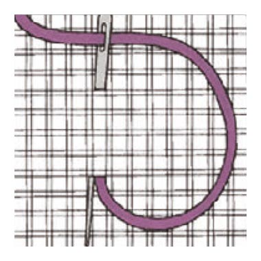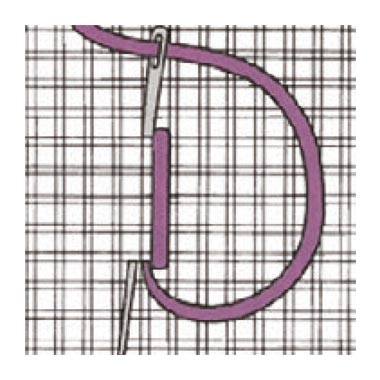 Von unten her im größeren Fadenkreuz ausstechen, den Faden nach rechts legen, in gewünschter Stichlänge senkrecht nach oben einstechen und links im kleinen Fadenkreuz ausstechen. Den Faden durchziehen.