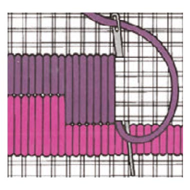 Auf diese Weise Stich für Stich aneinanderreihen, dabei abwechselnd jeweils in ein großes und kleines Fadenkreuz stechen. Die Stiche liegen senkrecht parallel nebeneinander und bedecken das Gewebe völlig.