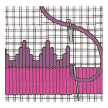 Hier entsteht ein einfaches Muster, indem die aneinandergereihten Stiche in unterschiedlichen Längen zur Vorreihe und einer neuen Garnfarbe gearbeitet werden.