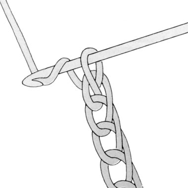 Mit der Anfangsschlinge liegt die erste Luftmasche auf der Nadel. Für jede weitere Luftmasche wird der Faden von hinten nach vorne über die Nadel gelegt (es wird also 1 Umschlag gebildet). Dieser Umschlag wird dem Haken der Nadel durch die vorhandene Schlinge gezogen: Die 2. Luftmasche ist entstanden. Diesen Vorgang laufend wiederholen: Umschlag bilden und Faden durchziehen, bis die gewünschte Anzahl Luftmaschen erreicht ist (Abb. 3). Man achte darauf, dass die Maschen gleichmäßig groß sind.  Diese Kette von Anschlagluftmaschen bildet die Grundlage fast jeder Häkelarbeit. Anschlagluftmaschen sollten nicht zu lose sein, da sie dann keinen schönen Rand ergeben; sie dürfen aber auch nicht zu fest gehäkelt werden, weil es sonst bei der folgenden Reihe schwierig wird, mit der Häkelnadel in diese zu kleinen Luftmaschen einzustechen. Luftmaschen dienen aber auch als Wendeluftmaschen, d.h. sie werden für den Übergang von einer Reihe zur nächsten benutzt.