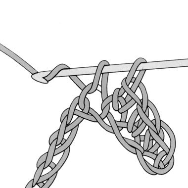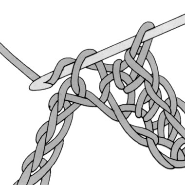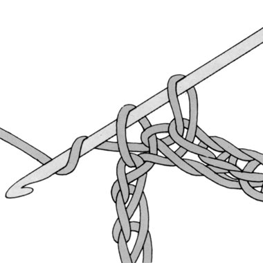 1 Umschlag bilden, in eine Luftmasche einstechen, 1 weiteren Umschlag bilden und den Faden durch die Luftmasche ziehen (es sind jetzt 3 Schlingen auf der Nadel), noch 1 Umschlag bilden und diesen Faden durch alle 3 auf der Nadel liegenden Schlingen ziehen, d.h. 3 Schlingen auf einmal abmaschen. Die letzte Schlinge bleibt auf der Nadel. Für alle weiteren halben Stäbchen diesen Vorgang wiederholen.