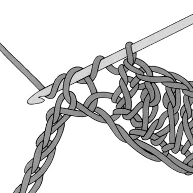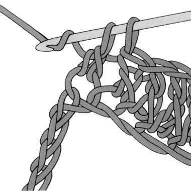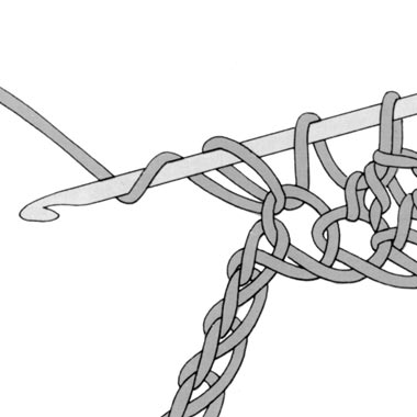 1 Umschlag bilden, in eine Luftmasche einstechen, 1 weiteren Umschlag bilden und den Faden durch die Luftmasche ziehen (Abb.8) ,(es sind jetzt 3 Schlingen auf der Nadel), wieder 1 Umschlag bilden und den Faden durch die beiden ersten Schlingen auf der Nadel ziehen (Abb.9). Die letzte Schlinge bleibt auf der Nadel. Für alle weiteren Stäbchen diesen Vorgang wiederholen.