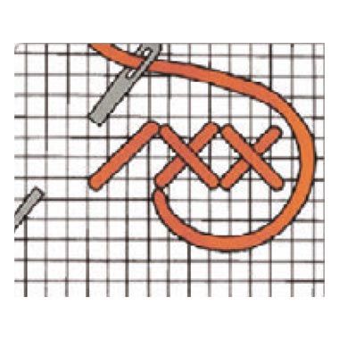 Die Abbildung zeigt den Beginn einer waagerechten Kreuzstichreihe. In der Hinreihe werden die Grundstiche von links unten nach rechts oben dem Muster entsprechend über eine Anzahl von Gewebefäden ausgeführt.