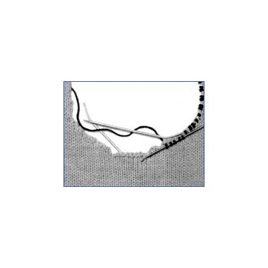 Zum Anstricken von Halsbündchen wird die Maschenzahl, die dafür angegeben ist, mit der Häkelnadel und dem Halsrand aufgenommen. Diese Maschen werden mit der Rundstricknadel aufgefasst.